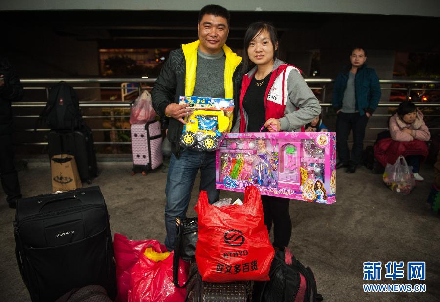 1月27日,在深圳火車東站,來自河南商丘的呂國旗和妻子在展示給7歲女兒和4歲半兒子分別準(zhǔn)備的洋娃娃和玩具車。他們一年沒見孩子了。春運(yùn)期間的火車站里,帶著大包小包的旅客當(dāng)中許多是留守兒童的父母,他們往往好幾個(gè)月甚至一年才能見到孩子一次。過年了,能見到思念已久的孩子。在他們回家的行囊中,也備好了用心為孩子準(zhǔn)備的禮物。新華社記者毛思倩攝