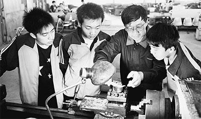 山東鄒平縣職業(yè)學(xué)校機(jī)械實(shí)訓(xùn)室內(nèi),一企業(yè)老技工指導(dǎo)學(xué)生車床操作。人民視覺