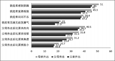 父母都在外地的留守兒童最多,占51.7%,其次是父親外出的,占40.2%,母親外出的最少,占8.1%,但母親外出的留守兒童在各個方面的問題最突出。他們生活習(xí)慣更差,網(wǎng)絡(luò)不良行為更多,意外傷害更多,對留守生活的負(fù)面體驗也更高;學(xué)校表現(xiàn)更糟糕,遭受欺負(fù)的比例更高;在自我接納和人際交往方面,母親外出的留守兒童表現(xiàn)矛盾,他們覺得自己更有用,同時也覺得別人比自己運氣好;他們覺得自己更受人歡迎,但不愿意和別人談話聊天;他們認(rèn)為自己的好朋友更多,但無助感最強。