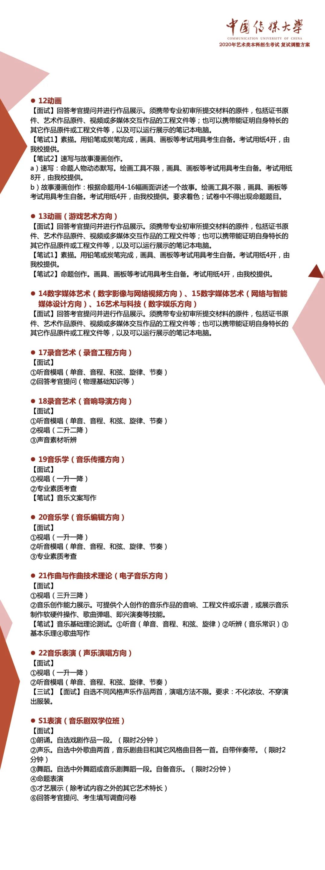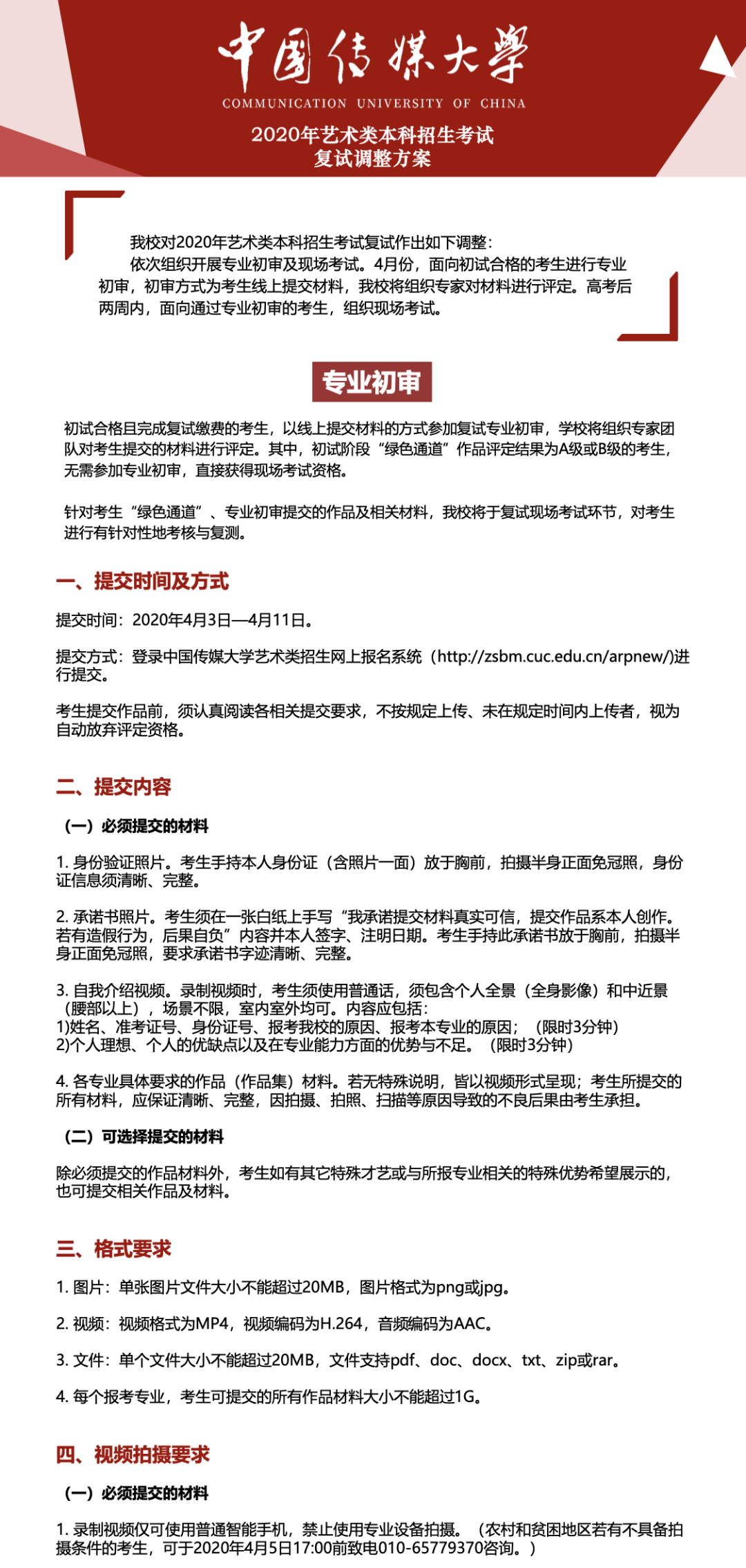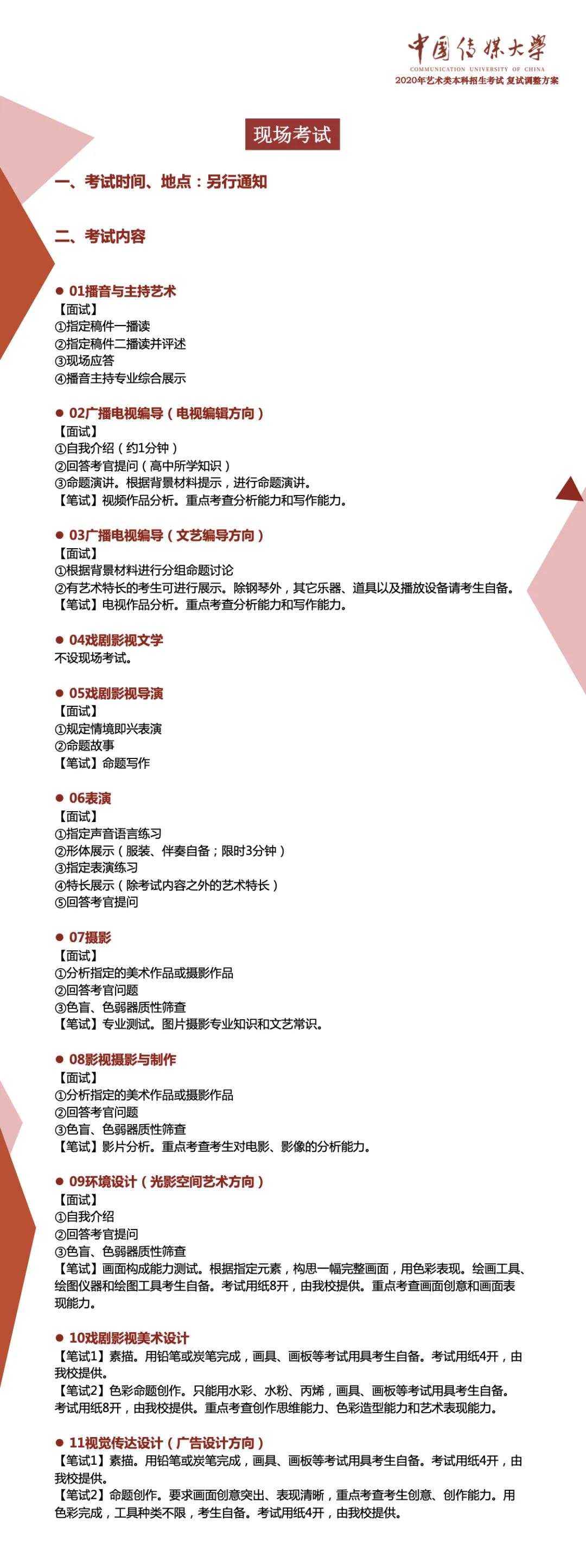 根據(jù)教育部及北京市有關(guān)藝術(shù)類專業(yè)招生考試的決策部署,切實(shí)保障師生生命安全和身體健康,結(jié)合中國傳媒大學(xué)藝術(shù)類專業(yè)人才選拔和培養(yǎng)實(shí)際需要,經(jīng)學(xué)校研究決定,對(duì)2020年藝術(shù)類專業(yè)考試復(fù)試方案作如下調(diào)整: