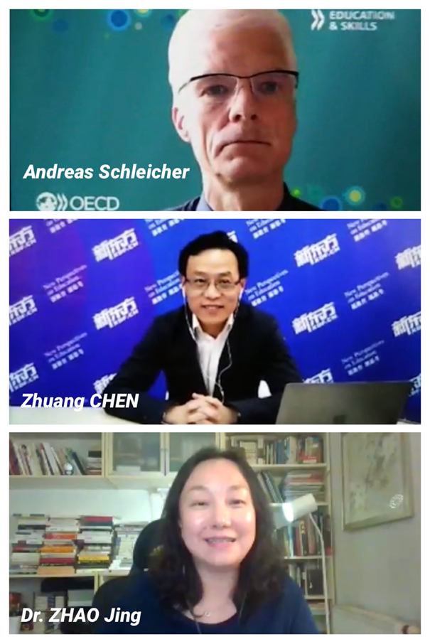 央廣網(wǎng)北京5月13日消息 5月12日,由新東方教育科技集團(tuán)與未來(lái)學(xué)校研究院聯(lián)合主辦的“新教育 新思考”教育研討會(huì)正式開(kāi)幕,當(dāng)晚舉行了首場(chǎng)國(guó)際研討。新東方國(guó)際合作部總經(jīng)理陳莊,連線遠(yuǎn)在法國(guó)的經(jīng)濟(jì)合作與發(fā)展組織(OECD)教育和技能部部長(zhǎng)AndreasSchleicher,以及在北京的劍橋大學(xué)國(guó)際考評(píng)部東亞區(qū)總監(jiān)趙靜博士,圍繞時(shí)下教育面臨的挑戰(zhàn)和未來(lái),進(jìn)行了深入探討。