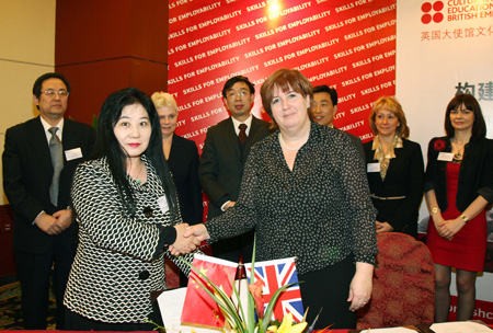 教育部職業(yè)教育與成人教育所副所長高瑛(左)和英國大使館文化教育處參贊白瓊娜女士(右)簽署合作協(xié)議