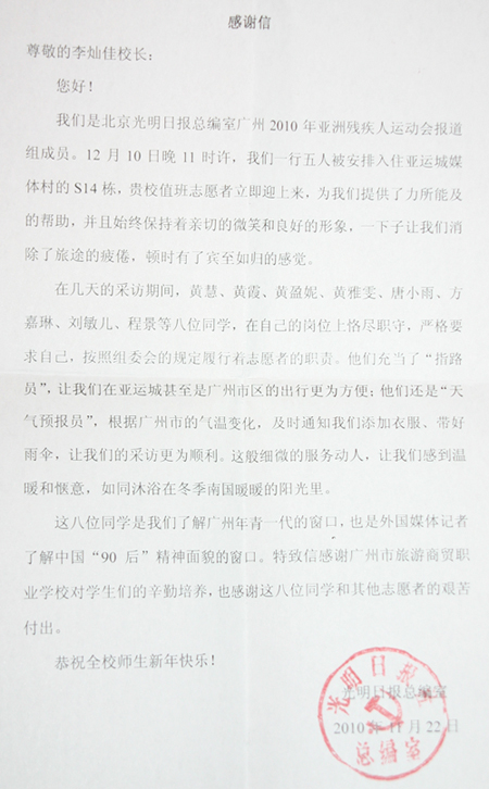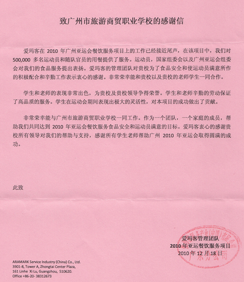 愛瑪感謝信 學(xué)校在發(fā)展過程中,也與廣東的、廣州的旅游商貿(mào)企業(yè)建立非常密切的聯(lián)系。像白天鵝賓館、花園酒店等五星級酒店都是我們的合作辦學(xué)單位。這些企業(yè)每年都到學(xué)校來招聘。我們也通過這樣的合作使我們的學(xué)生能找到好的工作。 在辦學(xué)的過程中,我覺得學(xué)校師資隊伍的建設(shè)非常重要。我們不僅要“雙師型”的老師,還要培養(yǎng)老師和學(xué)生溝通的能力。去年我們在學(xué)校辦了老師心理健康的B證培訓(xùn)班。主要是讓我們的班主任、系主任、教導(dǎo)處的老師參加,因為他們和學(xué)生的接觸比較多。通過培訓(xùn)班的學(xué)習(xí),我們有168位老師獲得了心理輔導(dǎo)師的B類證書,他們在我們的日常教學(xué)中發(fā)揮了非常大的作用。