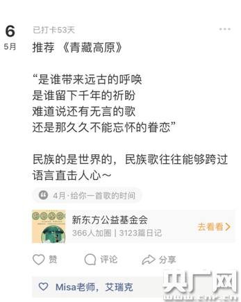 這是新東方上海學(xué)校老師趙晨的“百日行動(dòng)派”打卡日記。從3月15日至5月6日,她已經(jīng)連續(xù)打卡53天,為鄉(xiāng)村孩子推薦了30本書,23首歌曲,累計(jì)捐贈(zèng)了1.3萬枚“堅(jiān)持幣”。