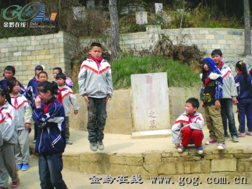 走進(jìn)學(xué)校大門,迎面兩側(cè)就是三間板房,光線比較昏暗,其中一間板房的門頭上貼有一張紅紙,上面寫著六年級(jí),里面的學(xué)生正在聚精會(huì)神的聽老師上課,再往前走大約10米遠(yuǎn),一塊微微傾斜的場(chǎng)地(大約100平方米)就是學(xué)校的操場(chǎng),五年級(jí)的學(xué)生正在上體育課,而在操場(chǎng)右側(cè)的一小坪壩上,竟然矗立著一座大大的墳?zāi)?只有膽大的學(xué)生才敢靠近,而膽小的只能望而卻步。