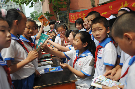 前進(jìn)小學(xué)的學(xué)生在出售圖書