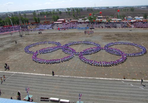 學(xué)生們組成奧林匹克五環(huán)圖案
