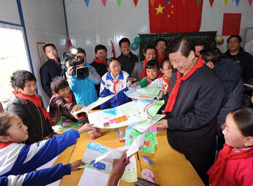 6月1日,中共中央政治局常委、中央書記處書記、國家副主席習(xí)近平專程趕赴青海玉樹地震災(zāi)區(qū),看望慰問災(zāi)區(qū)各族干部群眾和災(zāi)后重建人員,考察群眾安置情況和災(zāi)后重建工作。這是習(xí)近平在玉樹州紅旗學(xué)!拔倚闹械男掠駱洹敝黝}繪畫活動現(xiàn)場,興致勃勃地欣賞學(xué)生們創(chuàng)作的兒童畫。