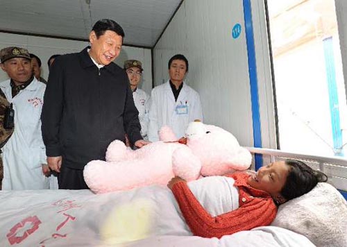6月1日,中共中央政治局常委、中央書記處書記、國家副主席習(xí)近平專程趕赴青海玉樹地震災(zāi)區(qū),看望慰問災(zāi)區(qū)各族干部群眾和災(zāi)后重建人員,考察群眾安置情況和災(zāi)后重建工作。這是在玉樹體育場濟南軍區(qū)野戰(zhàn)方艙醫(yī)院,習(xí)近平給正在接受治療的兒童送上“六一”國際兒童節(jié)禮物。