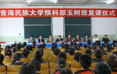 5月13日,青海民族大學預科部玉樹高中班復課儀式在嘹亮的國歌聲中舉行。青海省教育廳民教處處長雅拉毛、青海民族大學黨委副書記呼斯哈力其,副校長李生榮、張維平、楊發(fā)玉,宣傳部部長喬文良,預科部副主任莫乃玉,社會愛心人士馬志云先生等出席復課儀式。預科部主任包錦淵同志主持會議。