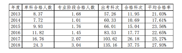 根據(jù)中注協(xié)2018年注冊會計師考試分析報告(2019年暫未公布),2018 年專業(yè)階段考試6個科目平均合格率為27.93%,比2017年提高了2.66%。綜合階段考試有1.95 萬人通過并取得全科合格證書,合格率83.74%,比2017 年提高2.08%。其實,在2013-2018年間(除2014年外),注冊會計師專業(yè)階段考試的出考科次、合格科次均有所增加,6個科目的平均合格率保持在20%-30%水平,并有小幅上升。