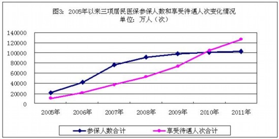 “十一五”期間是居民醫(yī)療保險全面建立和推廣的關(guān)鍵時期,黨中央、國務(wù)院把加快推進(jìn)基本醫(yī)療保障制度建設(shè)作為深化醫(yī)藥衛(wèi)生體制改革的五項重點改革任務(wù)之一,加大投入、加強引導(dǎo),實現(xiàn)了基本醫(yī)療保障制度對城鄉(xiāng)居民的全覆蓋。2011年底,三項居民醫(yī)保參保人數(shù)合計超過10億人,當(dāng)年享受待遇合計12.69億人次,分別比2005年增長3.89倍和11.07倍(2005年以來三項居民醫(yī)保參保人數(shù)和享受待遇人次變化情況見圖3)。