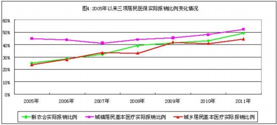 2005年以來,國家連續(xù)大幅調(diào)增新農(nóng)合財政補助水平,各級財政對新農(nóng)合的補助標(biāo)準(zhǔn)從2005年的每人每年20元增加至2011年的200元。截至2011年底,已將兒童白血病、先天性心臟病等8個重大疾病納入新農(nóng)合重大疾病保障范圍。新農(nóng)合和城鎮(zhèn)居民醫(yī)保政策范圍內(nèi)的報銷比例逐年提高,到2011年報銷比例分別達(dá)到了70%和62%。實際報銷比例近年來也穩(wěn)步上升,農(nóng)村尤為顯著。新農(nóng)合、城鎮(zhèn)居民醫(yī)保和城鄉(xiāng)居民醫(yī)保實際報銷比例分別由2005年的24.8%、45%和23.78%,提高到2011年的49.20%、52.28%和44.87%,分別增長了98.39%、16.18%和88.69%(2005年以來三項居民醫(yī)保實際報銷比例變化情況見圖4)。