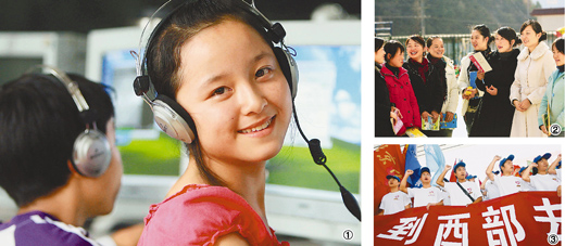 圖③:2006年,6000多名大學(xué)生志愿者陸續(xù)奔赴西部基層開展服務(wù)。圖為大學(xué)生志愿者在出征前宣誓。