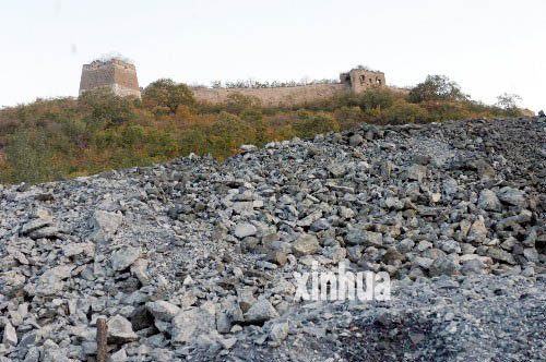 位于青龍滿族自治縣祖山鎮(zhèn)拿子峪村的長城腳下堆積著一個已經(jīng)關(guān)停的小煤礦的廢料(10月19日攝)。在河北省青龍、撫寧兩縣交界處,一些礦主在長城保護區(qū)范圍和建設(shè)控制帶內(nèi)進行開礦采石,威脅長城安全。 (新華社記者鞏志宏攝)