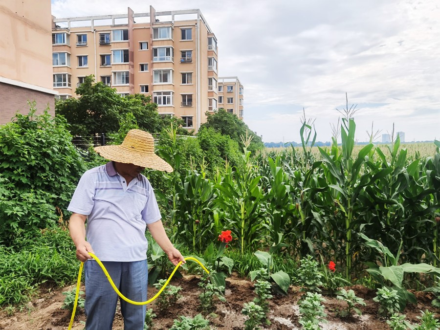 村民胡紹武在澆花,他家就在身后的樓房里(央廣網(wǎng)發(fā) 劉旭攝)