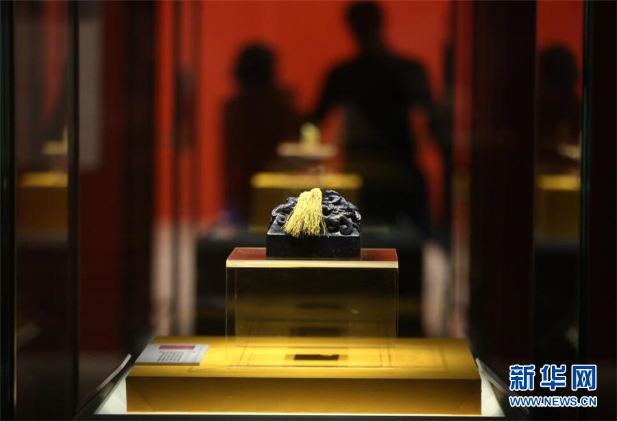 圖為在“龍?zhí)╁酚睢蕦m養(yǎng)心殿文物特展”上展出的文物《養(yǎng)心殿銘》青金石蟠螭鈕印。新華網(wǎng)姜冰攝 1月18日,“龍?zhí)╁酚睢蕦m養(yǎng)心殿文物特展”在遼寧省博物館正式啟幕。展覽共展出285件/組養(yǎng)心殿內(nèi)重要文物和陳設(shè)等皇室用器,涵蓋玉器、琺瑯、陶瓷等多個門類。據(jù)了解,該展覽持續(xù)至4月18日。 -