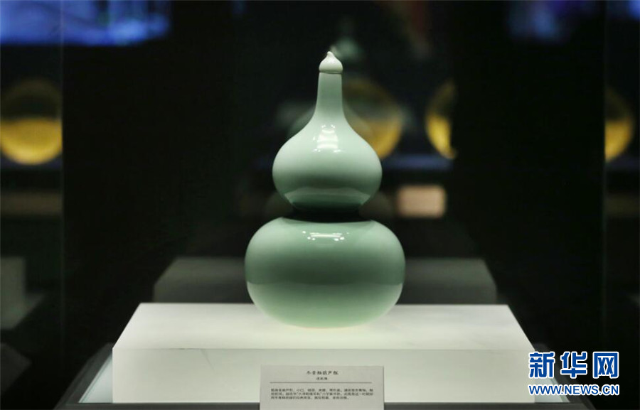 圖為在“龍?zhí)╁酚睢蕦m養(yǎng)心殿文物特展”上展出的文物冬青釉葫蘆瓶。新華網(wǎng)姜冰攝