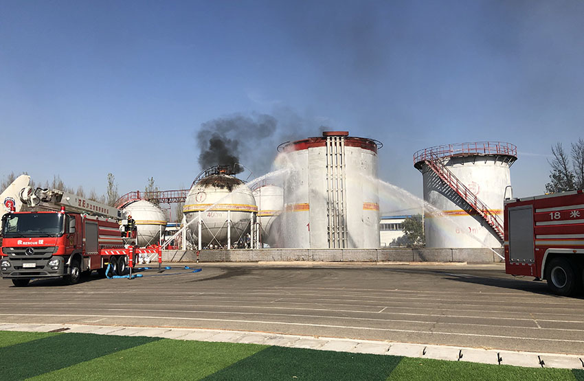 演練共分為消防救援裝備展示、大練兵大比武科目演示和滅火救援實戰(zhàn)演練三大內(nèi)容。演練現(xiàn)場集中展示了由400名身著滅火戰(zhàn)斗服、搶險救援服、輕型防化服、重型防化服組成的4個消防指戰(zhàn)員方隊,以及通訊指揮、城市滅火戰(zhàn)斗、石油化工火災處置、高層建筑火災處置、消防救援戰(zhàn)勤保障、重型工程機械、機器人和無人機等8個消防車輛裝備方隊,進行了消防員登高訓練科目、滅火救援操法和搜救犬演示科目表演,開展了高層建筑滅火、石油化工裝置火災撲救實戰(zhàn)演練,并通過遠程視頻傳輸,同步觀看在大連、鞍山等地開展的大型油罐區(qū)、地震、水域、山岳等應急救援科目演示。上圖為演練現(xiàn)場模擬油罐區(qū)發(fā)生火災,油罐火災處置專業(yè)隊趕赴現(xiàn)場進行處置。李進媛 攝