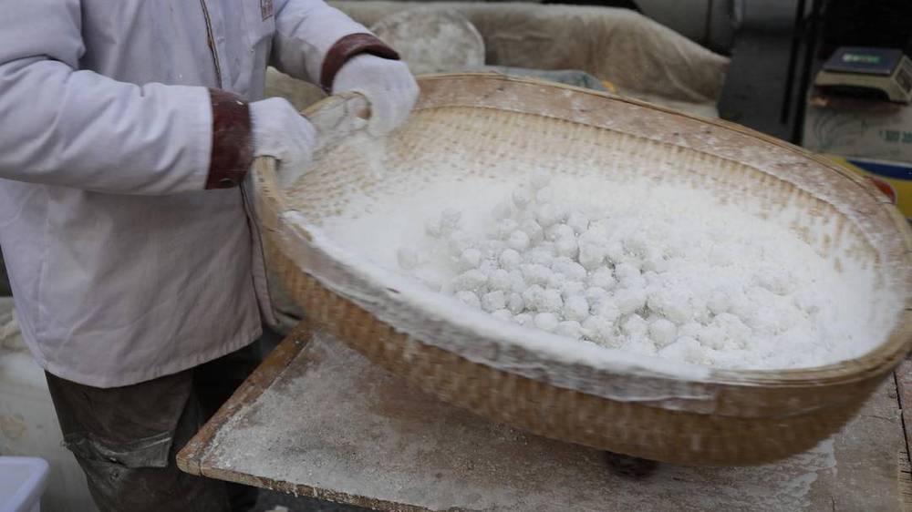 攤主正嫻熟地重復(fù)著傳統(tǒng) “搖元宵” 工序