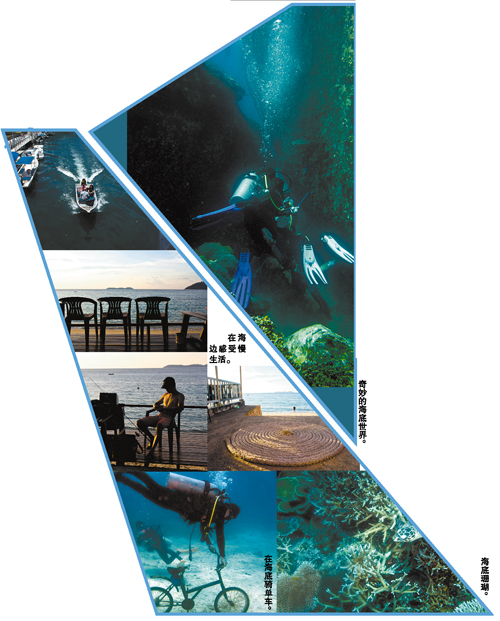 坐在度假屋陽臺的椅子上,放眼四周,不遠(yuǎn)處是天海連成一線的美景,湛藍(lán)的海面上漾起金光,薄薄的幾片彩霞映照著夕陽,一切都顯得和煦溫暖。在這里,隨便找一個(gè)舒服的角落停下來,沒有人認(rèn)識你,你可以穿平日里不敢穿的服裝,隨意之極地去享受慢節(jié)奏的心靈舒緩,游泳、喂魚、看書、曬太陽、看星星、聽海浪聲……欣賞著柔和的陽光與湛藍(lán)的海水融為一體的大自然巨畫。