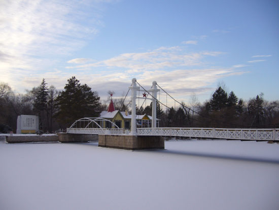 10O多年前,一群俄國人從歐洲一路東行南下,駐足扎蘭屯,將西方文化用最直接的方式帶到了這里。中東鐵路承東啟西、接南轉(zhuǎn)北,伴著吊橋園林的建成。吊橋公園是扎蘭屯的象征,由沙俄中東鐵路局修建于1905年,中東鐵路開工后,扎蘭屯就成了鐵路沿線的重要驛站,一些沙俄人士也來這里居住,吊橋公園建成后,成了供沙俄貴族們游樂的地方。百年吊橋,果然有貴族氣質(zhì),白色的橋身映襯著藍(lán)色的天空和水面,格外醒目,兩根巨大的鐵索懸空于水面,42根細(xì)鐵索承載著木制的踏板。走在橋上,略感晃動,卻有一種泛舟水上飄然欲仙的感覺。