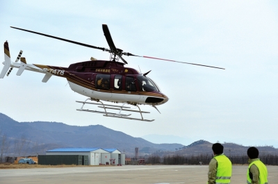 2月28日,在北京密云機(jī)場,一架旅游直升機(jī)搭載著游客開始低空飛行。當(dāng)天,北京密云低空旅游示范基地正式獲得國家旅游局授牌,該示范基地坐落于北京東北部的密云機(jī)場,基地投入運(yùn)行標(biāo)志著游客可以在密云機(jī)場搭乘直升機(jī)俯瞰密云城市美景線。新華社發(fā)