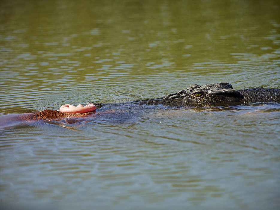 圖片中,一群馬匹正在岸邊休息,一條潛伏在水中的大鱷魚慢慢靠近馬群,嚇跑了岸上的成年馬匹,留下了一只夭折的幼馬,隨后,鱷魚迅速出擊,一口咬住了幼馬,將其拖入水中,游至一個(gè)可以讓它慢慢享受美味的地方,然后大口撕咬咀嚼起來。次日,攝影師又回到這里,發(fā)現(xiàn)這只巨鱷已經(jīng)將整只幼馬都吃掉了,此時(shí)正在淺灘里來回打滾,而它的肚子圓鼓鼓,看起來似乎很撐。