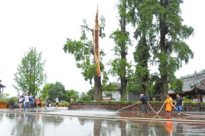 9日晚間時(shí)分,古鎮(zhèn)開始下起暴雨,夜里雷電交加!袄茁曁罅,根本沒聽見樹倒的聲音!奔幢憔嚯x古樹很近,方華說,他和家人都沒察覺古樹被雷劈的事情。