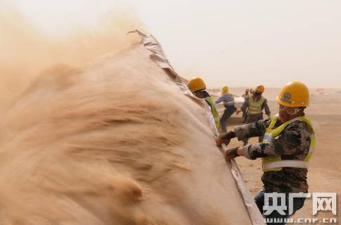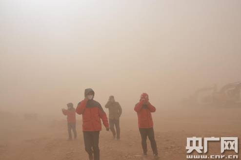 張立業(yè)說,這個工程最大的難度之一,就是自然環(huán)境太艱苦。這個標段全部位于戈壁沙漠、殘山丘陵地帶,部分段落穿越流動沙丘。當地干旱少雨,年最小降水量35mm,最大蒸發(fā)量卻達到4217mm,每年8級以上大風、沙塵暴、揚沙天氣82——142天,夏季地表溫度高達50——60度。張立業(yè):“兩天不刮風,第三天早早的刮?床灰娙耍嚩疾桓议_了,路都看不見。還不能在屋里呆,為什么,那個活動板房里嗆人,還得出門找個背風的方向,在外面讓風打,小石子打臉上跟刀割似的”。