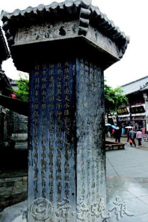 周村古商城內(nèi),在石碑前拍照留影的游客在石碑上留下大片油漬。記者 王鑫 攝