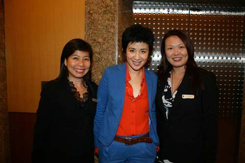 著名女星吳君如與酒店市場總監(jiān)林素芬女士(左)和宴會及會議銷售總監(jiān)盧韻娜女士(右)親密合影