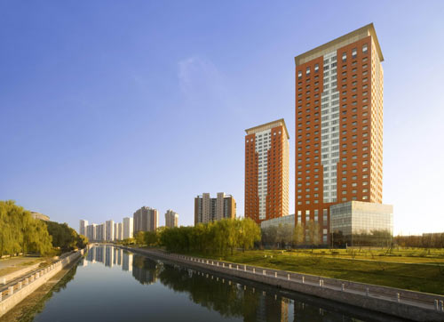 該飯店由兩座赤紅色高樓組合的雙子峰建筑組成,一層到四層采用獨(dú)特的玻璃圍裙設(shè)計(jì),擁有419間客房和套房?头吭O(shè)計(jì)簡約雅致,配套設(shè)施齊全:提供寬帶上網(wǎng)、私人保險(xiǎn)箱、空調(diào)、26寸液晶電視、國際多語言新聞娛樂電視節(jié)目。