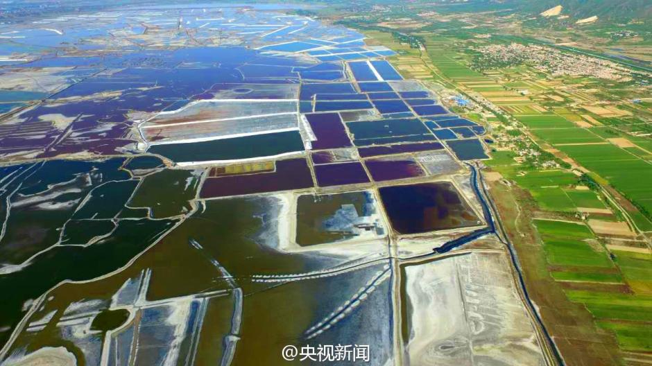 山西運城鹽湖被稱為中國的“死!,一年四季變換著不同的景色。近日,由于氣溫升高,鹽池中礦物質開始蒸發(fā),湖水變成了紅色、粉色、墨綠色、黃綠色等顏色。從空中望去,猶如一幅多彩畫卷。(央視記者裴大偉 攝影譚紅林)圖片來源:央視新聞官方微博