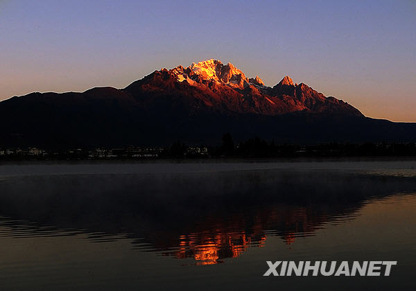 這是日出時分的玉龍雪山(11月8日攝)。云南西北部橫斷山脈中雪山林立,不僅有北半球最南、最高峰有5596米的大雪山玉龍雪山,還有最高峰6740米、至今無人能攀登上的梅里雪山,他們之間還矗立著主峰高度達5396米的哈巴雪山,以及海拔5000米以上山峰有20座的白馬雪山。這些氣勢磅礴、銀裝素裹的雪山,是清朗而明凈的高原上最動人心魄的勝境。新華社記者鄒崢攝
