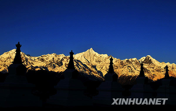 這是映襯在一排白塔之后的,日出時分的梅里雪山(11月3日攝)。新華社記者鄒崢攝