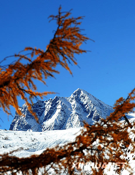 這是映襯在樹枝之后的白馬雪山的一座山峰(10月30日攝)。新華社記者鄒崢攝