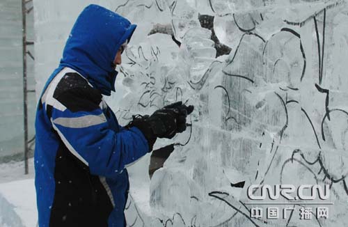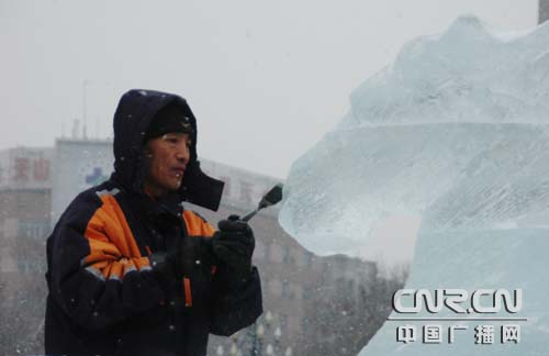 冰雕師傅頂風(fēng)冒雪雕琢作品