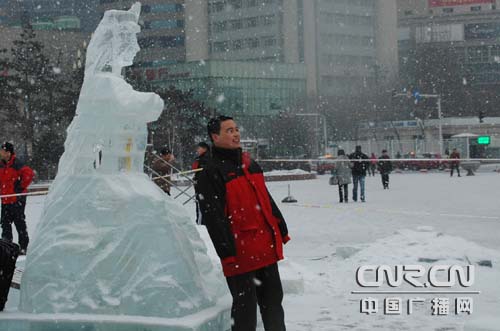 上午,記者先后來(lái)到了烏魯木齊人民廣場(chǎng)和烏魯木齊南湖廣場(chǎng),看見(jiàn)部分冰雕作品已初現(xiàn)雛形。古樸的長(zhǎng)城,莊嚴(yán)的烽火臺(tái),新中國(guó)成立60周年的紀(jì)念臺(tái),紀(jì)念?yuàn)W運(yùn)的鏤空冰墻,舞姿美麗婀娜的新疆姑娘,神奇的晶瑩迷宮,栩栩如生的飛馳駿馬,威風(fēng)凜凜欲騰空而去的猛龍,還有那演奏著天籟之音的維吾爾人......引得心急的游客們?cè)诒裾惯沒(méi)舉行,就迫不及待的拿起了手中的相機(jī)拍照留影,先睹為快。