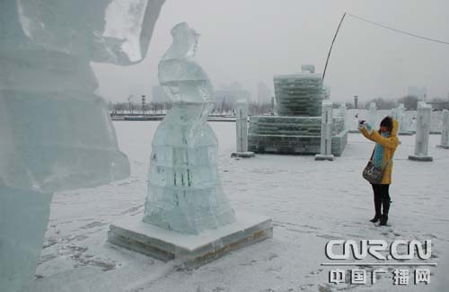 “心急”的市民冒著嚴(yán)寒與冰雕作品合影