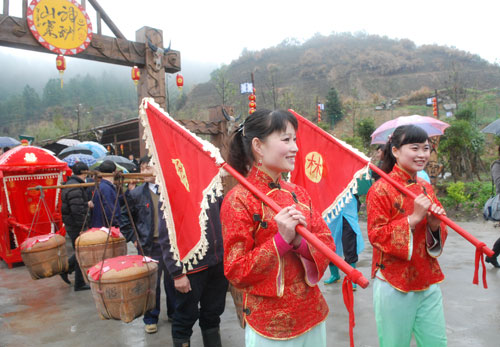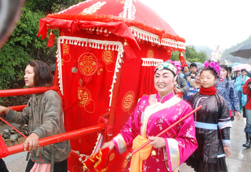 參觀完美麗的QQ農(nóng)場(chǎng),采訪(fǎng)團(tuán)一行便聚集到田園牧歌鄉(xiāng)村大舞臺(tái),觀看佤族同胞的表演。極具特色的民族服裝、優(yōu)美動(dòng)人的民族舞蹈、高亢悅耳的民族歌曲引得在臺(tái)下觀看的記者朋友們不時(shí)發(fā)出嘖嘖稱(chēng)贊。而之后的佤族傳統(tǒng)婚禮的慶典現(xiàn)場(chǎng)更是別有一番風(fēng)味。顯眼的大紅花轎,美麗的佤族新娘引得記者朋友們停下匆匆腳步,紛紛駐足觀看。在鑼鼓嗩吶等傳統(tǒng)樂(lè)器的襯托下,婚禮現(xiàn)場(chǎng)分外熱鬧,大家齊刷刷的拿出相機(jī),定格這難忘的一刻。