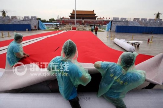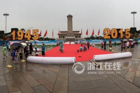今天是北京這段時間來難得的雨天,天安門廣場也被下午開始的大雨沖洗得干干凈凈,現(xiàn)在距離9月3日紀念中國人民抗日戰(zhàn)爭暨世界反法西斯戰(zhàn)爭勝利70周年大閱兵還有4天,天安門廣場的布置已經(jīng)基本準(zhǔn)備就緒。