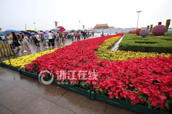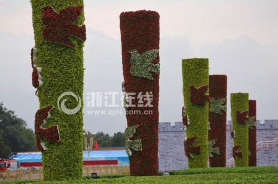 從革命英雄紀念碑到升旗臺正在鋪設(shè)紅地毯,紅地毯的兩邊是27日剛剛擺設(shè)完成的“長城”主題花壇。據(jù)了解,長城烽火臺的主景完全是用植物搭建而成,底座則由花卉、松柏和景觀石組成,其上分別立有“1945”和“2015”兩個年份。在“1945”的花壇上,有一群白鴿雕塑,寓意世界和平。