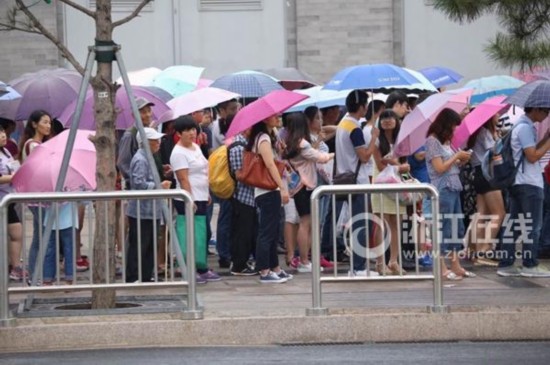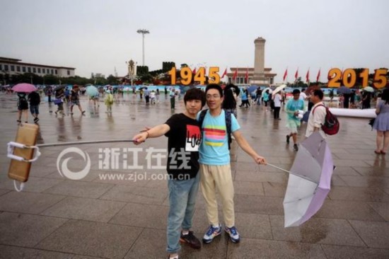 今天上午,北京市氣象臺發(fā)布了暴雨藍色預(yù)警。從下午5點開始,陣雨就時不時澆在天安門廣場上,可這并不影響游客們提前來天安門廣場觀賞的興致。記者看到有一家五口人從重慶趕來,就是為了看一下天安門廣場的布置,他們告訴記者,閱兵那天肯定只能在電視上看看,所以趁著這個周末,帶著孩子來北京,看看閱兵之前的北京到底什么樣。
