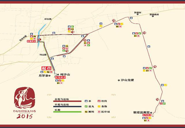 首屆敦煌馬拉松賽起點為鳴沙山廣場,終點為莫高窟九層塔。賽道將敦煌的自然、人文景觀相串聯(lián),將現(xiàn)代、歷史相融合,重新喚醒內(nèi)心激情,跑進千年敦煌。