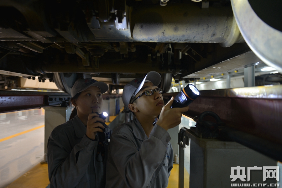 曹昱與男同事一起檢查動(dòng)車(chē)底部各部件狀態(tài)。