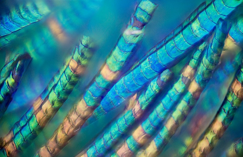 近日,加拿大軟件工程師和攝影師內爾將佳能Rebel T3i安裝在奧林巴斯BX53顯微鏡之上對孔雀的羽毛進行拍攝。鏡頭下的孔雀,其五顏六色的散羽如交織在一起的珠寶般絢爛奪目,難怪孔雀對其羽毛引以為傲。