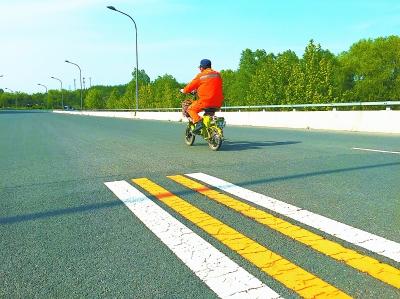 昨天記者來到了廣澤橋,在橋的南側(cè),7個大石頭墩子頂在橋頭之上,車輛無法通行。電動車、自行車則可以勉強從石墩的縫隙間擠過去,整體來說橋面上清靜得很,不少大爺大媽都把這里當(dāng)成了健身的場所。記者在橋上看到,橋上的設(shè)施已經(jīng)非常完善,包括路面上的交通標(biāo)識也已經(jīng)齊備,但到橋北段,路面上的交通標(biāo)示線卻齊刷刷地斷掉了。