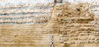 仔細觀察可以看到,夯土堆積層為一層夯土層一層鋪磚層,層層疊壓。夯土為深褐色黏土,大致平面分布,較致密,每層厚度不等。而素土夯土層,開口距地表1米,最深處距地表3米,為黃色綿沙土、褐色黏土和黃色細沙土,層層夯筑,大體呈平面或波狀分布,有的夯層包含少量堅硬的料礓石塊?脊殴さ貓(zhí)行領(lǐng)隊徐華鋒介紹:“從層位關(guān)系判斷,夯土鋪磚層建筑基槽、素土夯筑層為該遺址最早的一組堆積。夯土鋪磚層堆積的土質(zhì)土色、包含物、建筑工藝等與慈寧宮花園東院遺址的夯土夯磚層明顯一致,可早到明代早期;而素土夯筑層出土的布紋瓦、琉璃瓦、黑釉、白釉瓷片等遺物具有明顯的金元時代風格。按照考古發(fā)掘‘就晚不就早’的原則,根據(jù)地層關(guān)系和包含物可以初步推斷夯土鋪磚層建筑基槽和素土夯筑層的年代為元代!