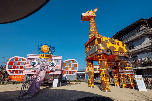 戶外設(shè)有大象溜滑梯、長頸鹿嘹望臺(tái)等裝置藝術(shù)。(圖片來源/宜蘭幸福轉(zhuǎn)運(yùn)站)